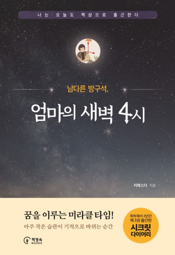 많은 육아서 읽으며 보다 나은 육아 방법을 갈구하고, 나의 부족한 모습을 개선하려고 노력하는 많은 엄마들이 있다. 육아에 혼신의 힘을 다하다가 자신을 잃어가는 것 같아서 불안하고 자신을 찾고 싶은 간절함이 생겨서 자기 개발서를 찾는 엄마들이 있다. 이것은 비단 몇몇의 이야기가 아닐 것이다. 엄마가 된 여자라면 누구나 이 같은 생각은 한 번쯤은 했을 것이라고 생각한다. 그러나 이것을 어떻게 극복했고 어떻게 나다움을 지키며 엄마로서 살아가고 있는지는 사람마다 다를 것이다. 극복한 사람도 있을 것이고, 그저 지금이 그런 때라고 생각하며 하루하루 육아에 치여서 사는 엄마도 있을 것이다. 나는 그 어떤 삶도 잘한 것이다, 못한 것이다라고 판단할 수 없다고 생각한다. 아니 가장 현실적으로 육아할 때는 일단 육아에 집중하고 아이가 성인이 되어 육아라는 일이 사라진 즈음에 또 다를 나의 삶을 찾아 시작하면 그만이라고 생각하기도 한다. 얼마나 치열하게 살아야 잘 살고 있다, 멋있는 삶이다 아는 이야기를 들을 수 있을까? 아니 꼭 그렇게 멋있는 삶이라는 말을 누군가에게 들을 수 있어야 만이 멋있는 삶일까? 그저 내 삶에 만족하며 이 삶 자체를 즐긴다면 그것이 승자가 아닐까? <엄마의 새벽 4시>의 지에스더님은 두 아이의 엄마로 아이를 키우며 무기력해지는 자신의 모습을 이겨내고자 노력하였고, 자신을 위한 10분의 산책을 시작으로 지금은 새벽 4시 미라클 타임을 실천하며 글을 쓰시고, 강의도 하면서 활발한 생활을 하고 계신다. 참 멋있는 삶이다. 자신을 온전히 바라보는 시간 10분으로 시작하여하고 싶었던 일, 하고 싶은 일을 실행하고 실천하는 모습까지 발전한 것은 그저 흘려버릴 일은 아니다 싶었다. 치열하게 살면서 인생의 의미를 부여할 필요는 없지만, 나 자신을 바라보는 시간을 갖는 것 만으로 내 안에 갇혀있는 하고 싶은 일과 꿈을 찾아서 도전해보려는 용기가 생긴다는 것은 한 번쯤 해볼 만한 일이라는 생각이 들었던 것이다. 지킬 수 있는 시간 5분으로 시작해보는 것이다. 거창하게 1시간 동안 무엇을 한다는 계획이 아니라 5분 동안 나를 돌아보는 시간을 갖는 것이 나의 인생의 미라클 타임으로 자리 잡힐 수 있다면 우리 한번 해볼 만하지 않은가?